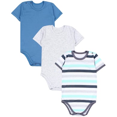 Ein Set enthält drei Bodys in verschiedenen Graublau-Tönen und Designs.